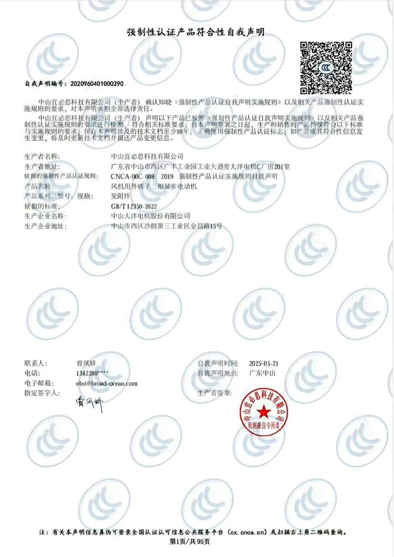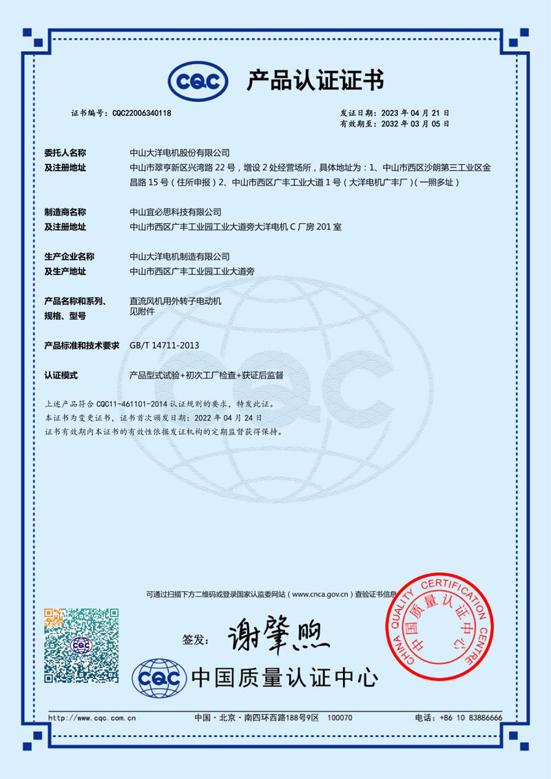 Complies with China's mandatory product certification standards, suitable for the AC backward centrifugal fan, fully meets electrical safety and EMC requirements, safer to use, and adapts to various domestic compliant scenarios.