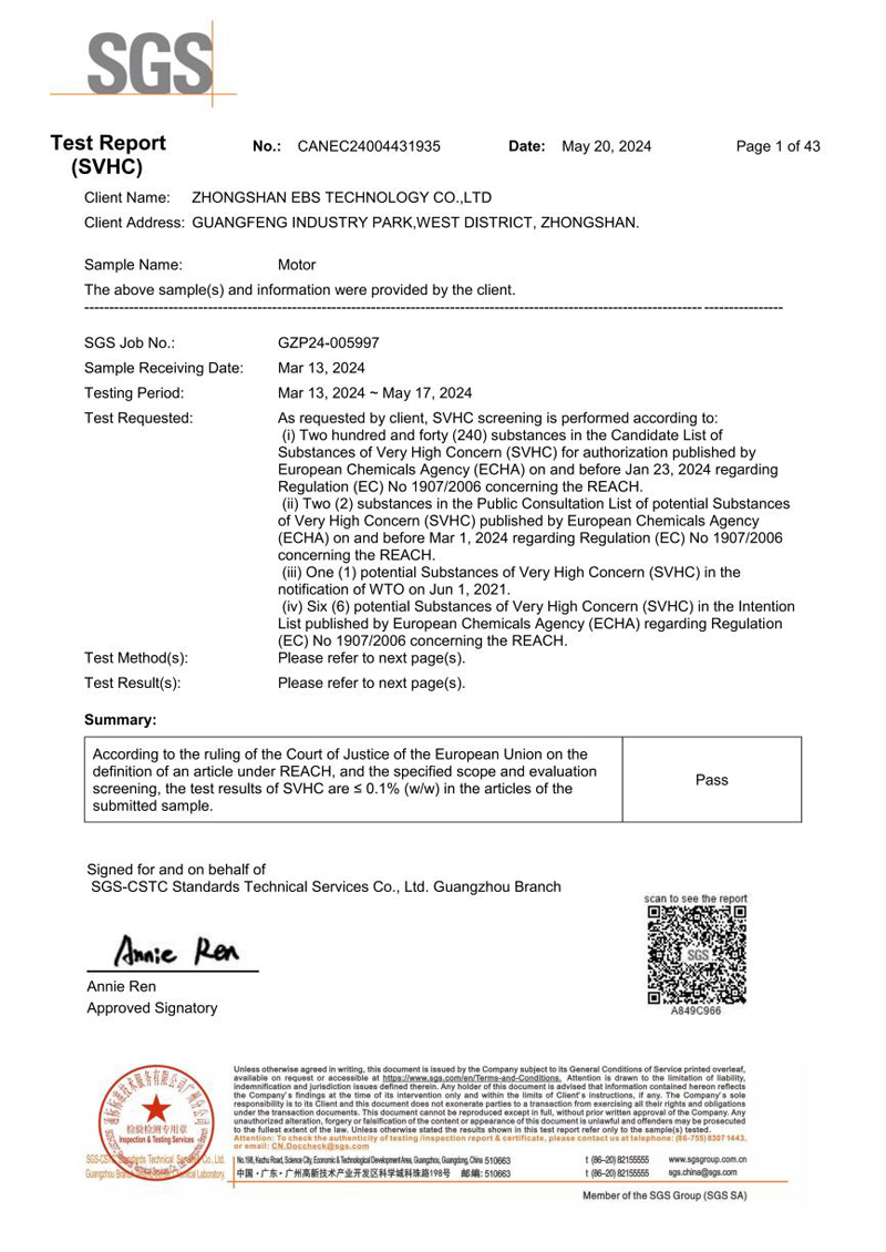 Certified by EU REACH regulation, fully controls chemical substance risks, suitable for the AC backward centrifugal fan, compliant for export, and adapts to global market applications.