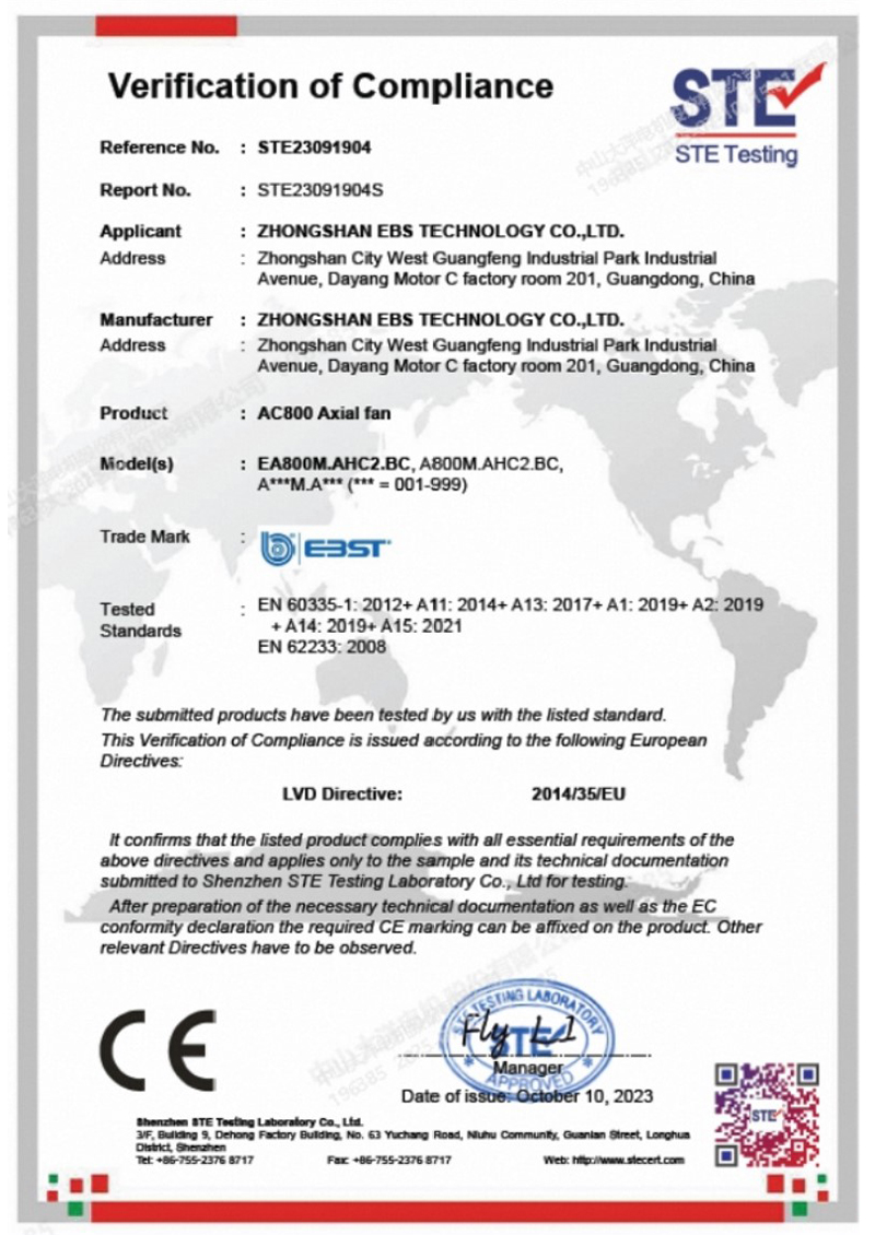 Complies with China's mandatory product certification standards, suitable for the axial fan. It fully meets electrical safety and EMC requirements, ensuring safer use and adapting to various domestic compliant scenarios such as household air conditioning and range hoods.